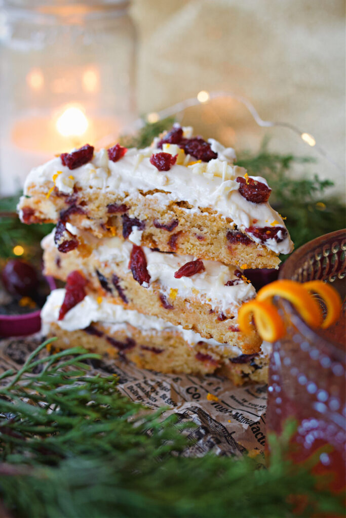 What are cranberry bars without their beautiful toppings? Sprinkle diced dried cranberries and chopped white chocolate bars on top of the frosting.