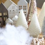 After the lights are added, go over them with the snow, weaving back and forth between the houses and trees for a very natural look. You can use any kind of snow here. I went with mini feather boas for a fluffy look and then covered up the lights just enough but let the glow shine through!