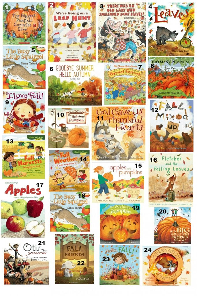 1.The Biggest Pumpkin Surprise Ever 2. We're Going on a Leaf Hunt 3. There was an Old Lady who Swallowed some Leaves 4. Leaves 5. The Busy Little Squirrel 6. Goodbye Summer Hello Autumn 7. The Berenstain Bears Harvest Festival 8. Too Many Pumpkins 9. I Love Fall 10. The Roll-Away Pumpkin 11. God Gave Us Thankful Hearts 12. Fall Mixed Up 13. Fall Harvests 14. The Fall Weather 15. Apples and Pumpkins 16. Fletcher and the Falling Leaves 17. Apples 18. The Bust Little Squirrel 19. The Itsy Bitsy Pumpkin 20. How Big Could Your Pumpkin Grow? 21. Otis and the Scarecrow 22. Fall Friends 23. Hello Fall! 24. Hibernation Station