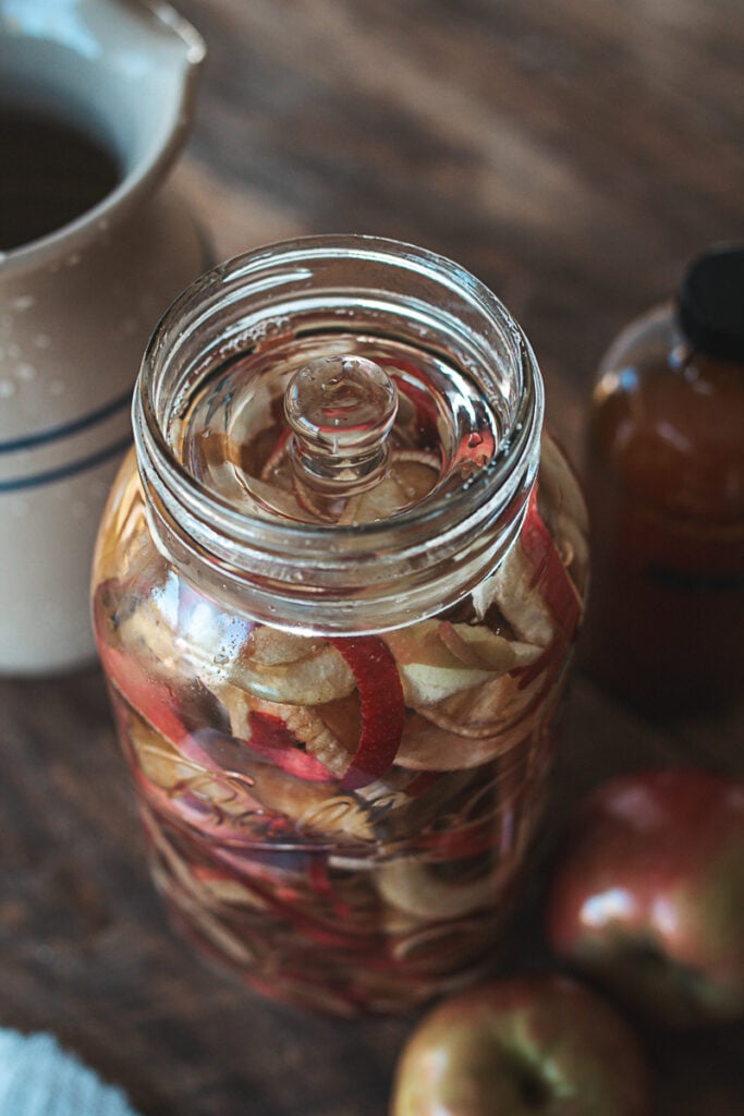 - Prepare Apple Scraps: Collect apple peels, cores, and leftover pieces. Remove any rotting parts. Place the apple scraps into a clean half gallon mason jar, filling it half to three quarters of the way to to top.