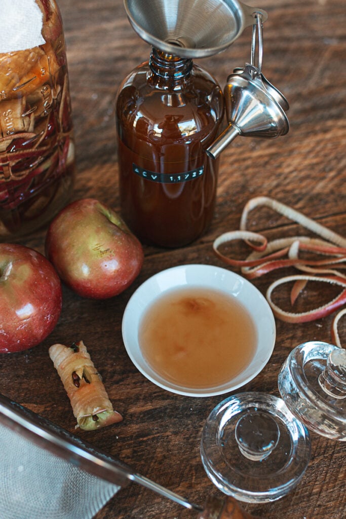 When you notice this gentle tang and the fruit pieces begin to float less actively, it's time to strain out the apple scraps.Don't wait too long, or the solids may start to break down and cloud the vinegar. Strain through a fine mesh sieve or cheesecloth into a clean glass jar or dark amber bottle.