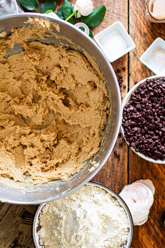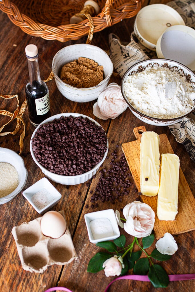 - Simple ingredients: Butter, white sugar, dark brown sugar, purpose flour, and mini chocolate chips come together to make the best cookies.